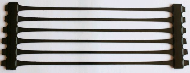 2、單向塑料土工格柵是一種以高分子聚合物為主要原料,經過單向拉伸使原來分布散亂的鏈形分子重新定向排列呈線性狀態,經擠出壓成薄板再沖規則孔網,然后縱向拉伸而成的高強度土工材料。